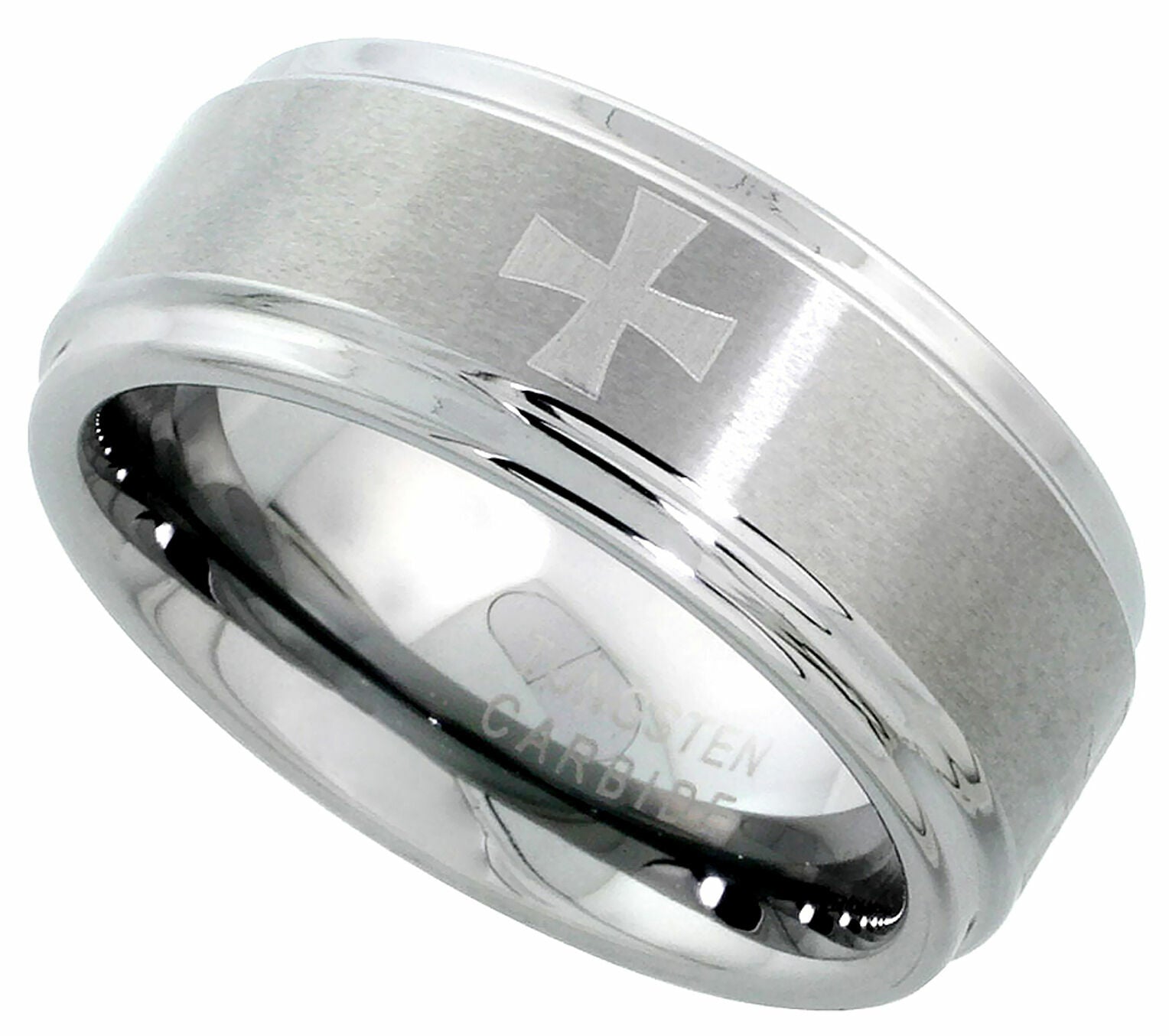 Tungsten Carbide Ring Men Wedding Band Etched Maltese Crosses Recessed Edge 9mm